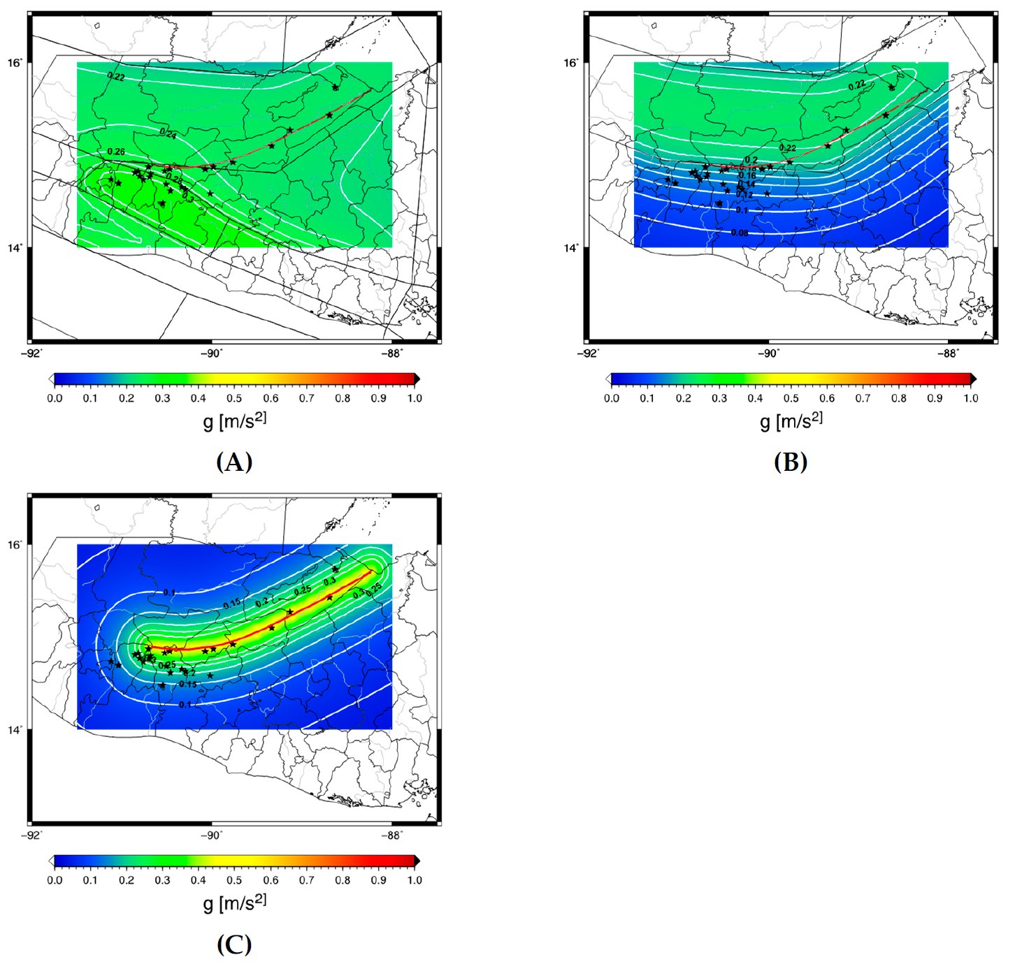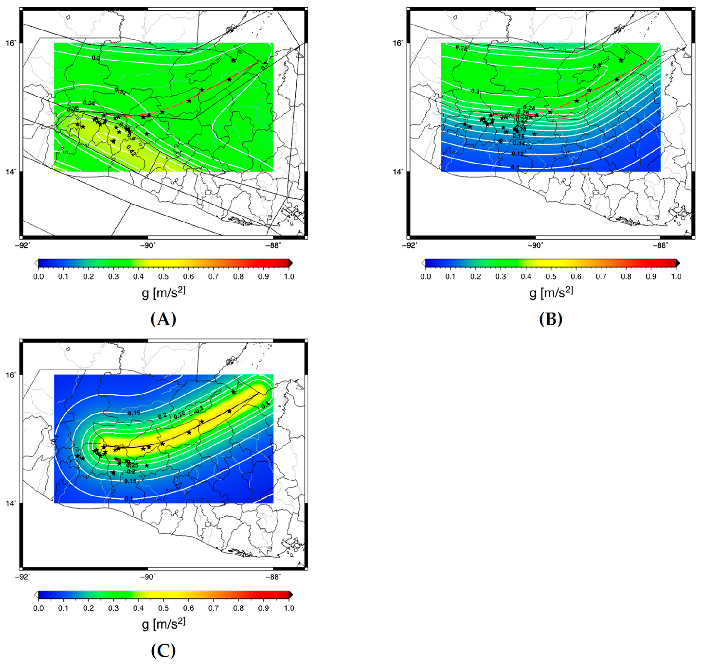 Hazard maps for soil ground and 300 years return period for different configurations: (A) Using crustal SZ; (B) using only the SZ “D3_G6”; (C) deterministic PGA distribution calculated from the Motagua fault (red line) for M=7.5. The black stars represent the target sites.