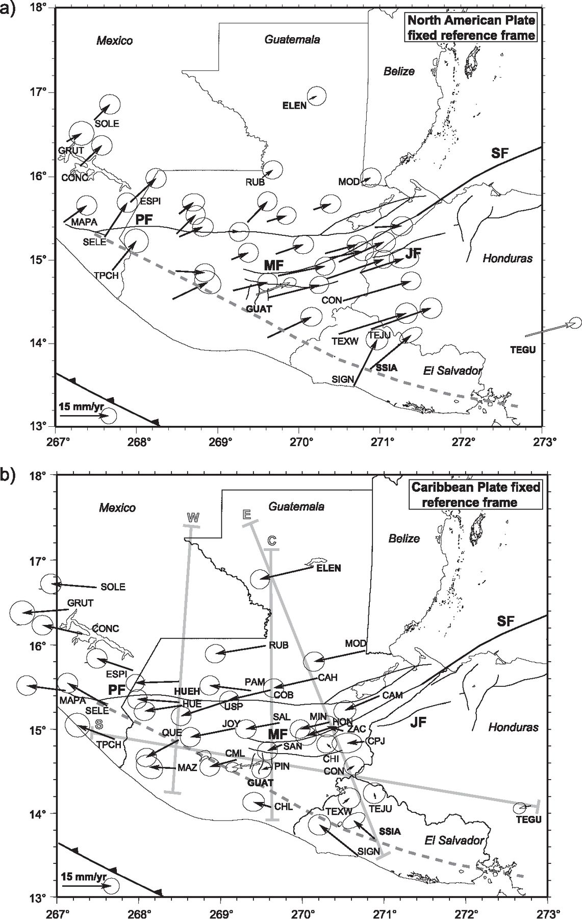 - Franco, A., C. Lasserre H. Lyon-Caen V. Kostoglodov E. Molina M. Guzman-Speziale D. Monterosso V. Robles C. Figueroa W. Amaya E. Barrier L. Chiquin S. Moran O. Flores J. Romero J. A. Santiago M. Manea V. C. Manea, 2012. Fault kinematics in northern Central America and coupling along the subduction interface of the Cocos Plate, from GPS data in Chiapas (Mexico), Guatemala and El Salvador in Geophysical Journal International., v. 189, no. 3, p. 1223-1236. DOI: https://doi.org/10.1111/j.1365-246X.2012.05390.x