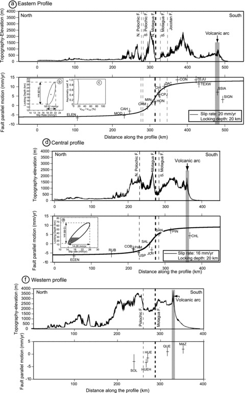 - My estimate from the figure is that the fault system shows about 18 mm per year in the Eastern Profile and about 14 mm per year in the Central Profile. The authors calculate 20 and 16 mm per year (my estimate was close).
