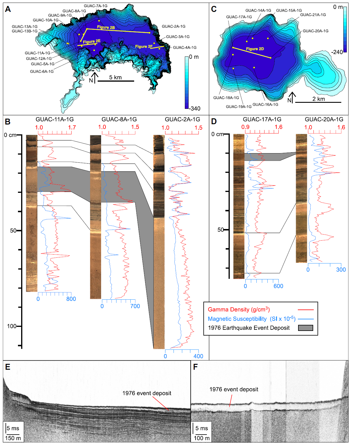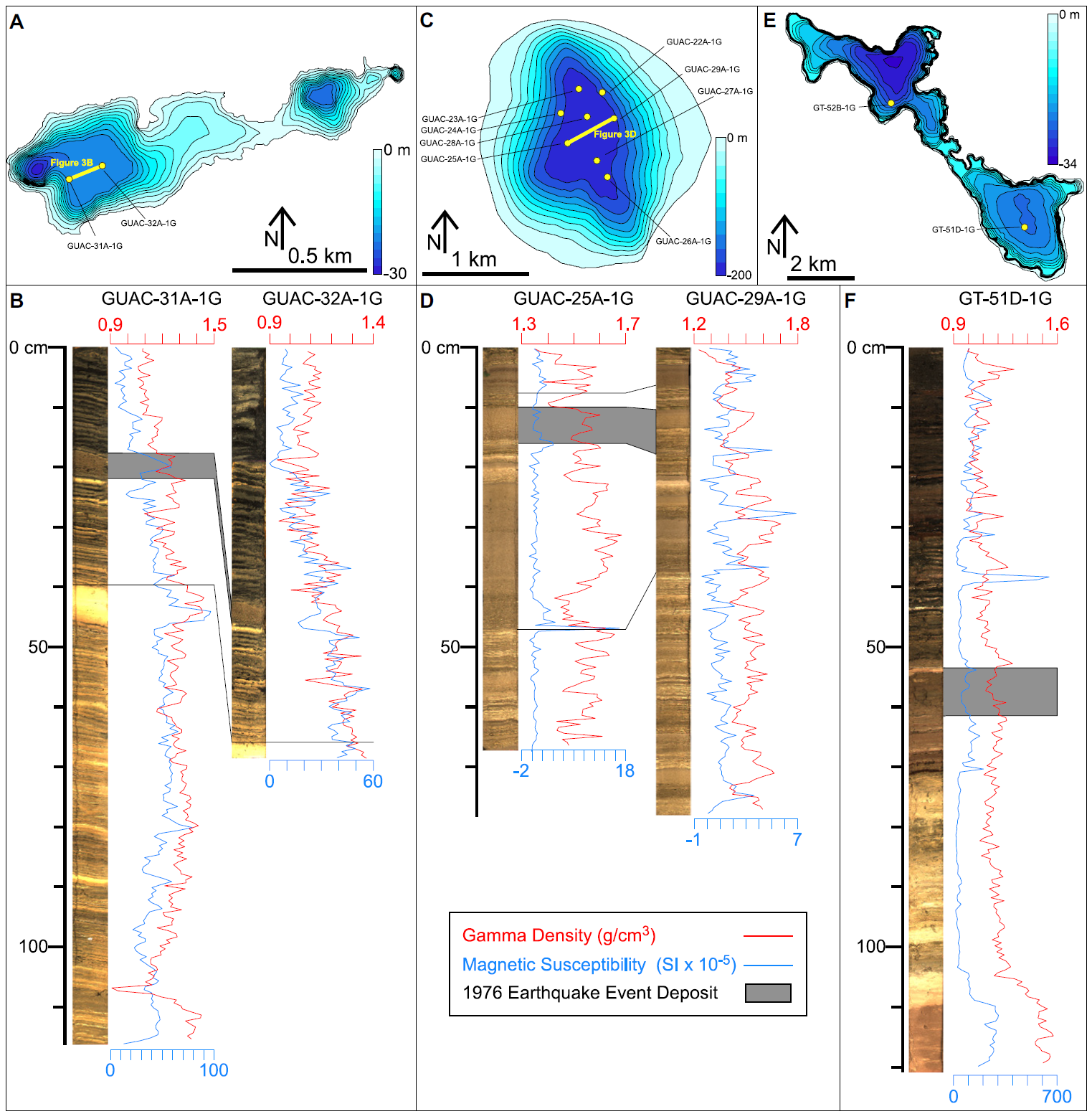 Bathymetric maps of lakes Atitlán (A) and Ayarza (C) showing cored locations (yellow dots). Correlation of three cores from Lake Atitlán (B) and Lake Ayarza (D) show the 1976 event deposit and correlation lines (black). Seismic reflection profiles on the western depocenter of Lake Atitlán (E) showing continuous high amplitude reflections. A low amplitude and discontinuous seismic reflection interval is interpreted as the 1976 event deposit, which thickens toward the central part of the depocenter (right side of figure), and (F) showing a low amplitude seismic package interpreted as the 1976 event deposit in the eastern depocenter of Lake Atitlán.