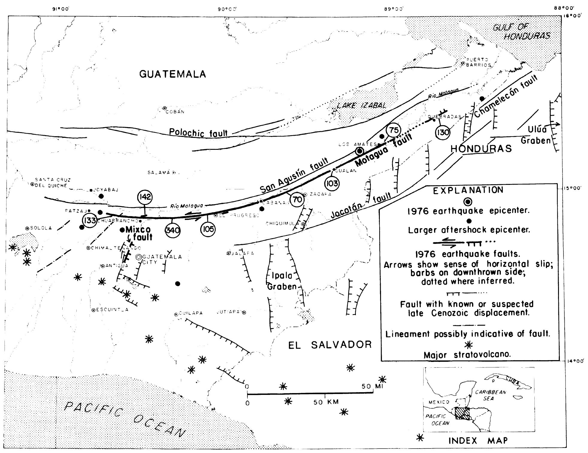Map showing the relation of segments of the Motagua and Mixco faults that moved during the earthquake of 4 February 1976 to the main shock epicenter, the larger aftershock epicenters, and major structural and volcanic features in northern Central America (4, 7, 35). Circled numerals along the Motagua fault indicate selected measured sinistral displacements in centimeters.