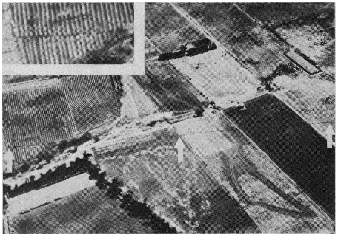 Oblique aerial view south toward the linear trace of the Motagua fault (arrows) in farmland west of Cabanias. Rows 1 m wide with about 70-cm sinistral offset may be seen in the field at the left side of the photograph and in the enlarged inset.