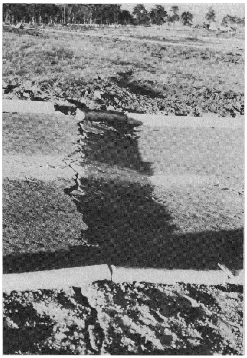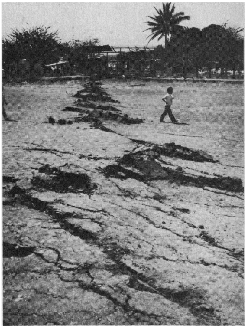View northeast along one of the larger breaks in the Mixco fault zone near Colonia El Milagro in Guatemala City. The displacement here is about 12 cm vertically down to the east and 5 cm dextrally. The break occurred at the base of a degraded scarp that was probably formed by previous late Quaternary displacement of this fault.
