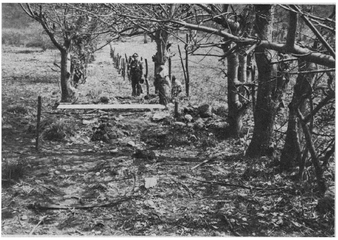 View south along a row of trees offset about 325 cm in a sinistral sense (indicated by white bar) where it is intersected by the Motagua fault. The man is standing on the fault trace, which is a single fissure oriented perpendicular to the line of trees at this locality.