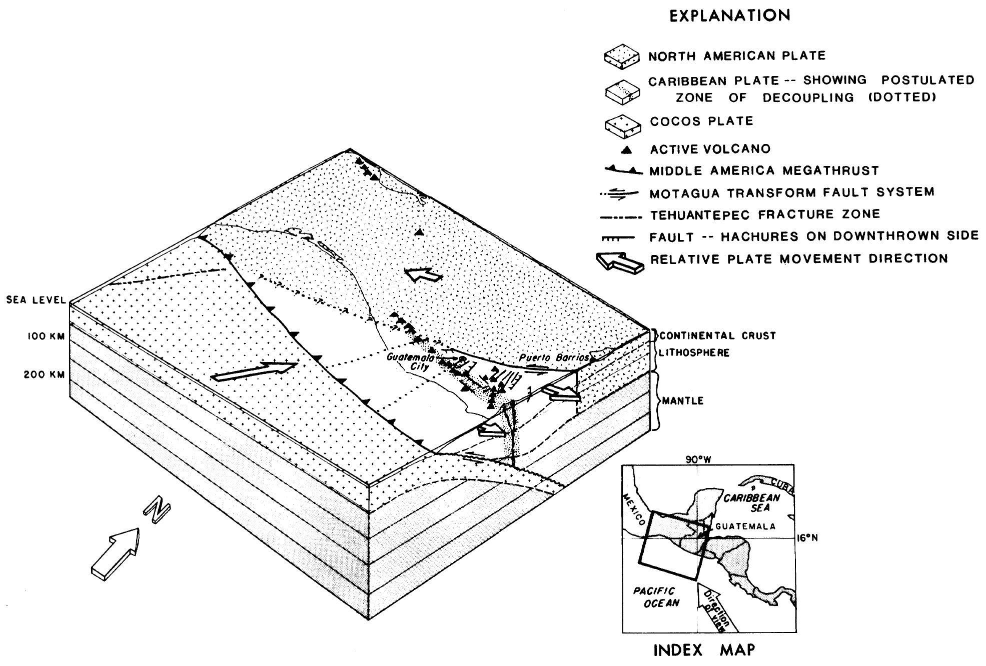 Block diagram showing the relation of the Motagua fault zone and the inferred zone of decoupling within the Caribbean plate to major tectonic and volcanic elements in Guatemala and contiguous countries.