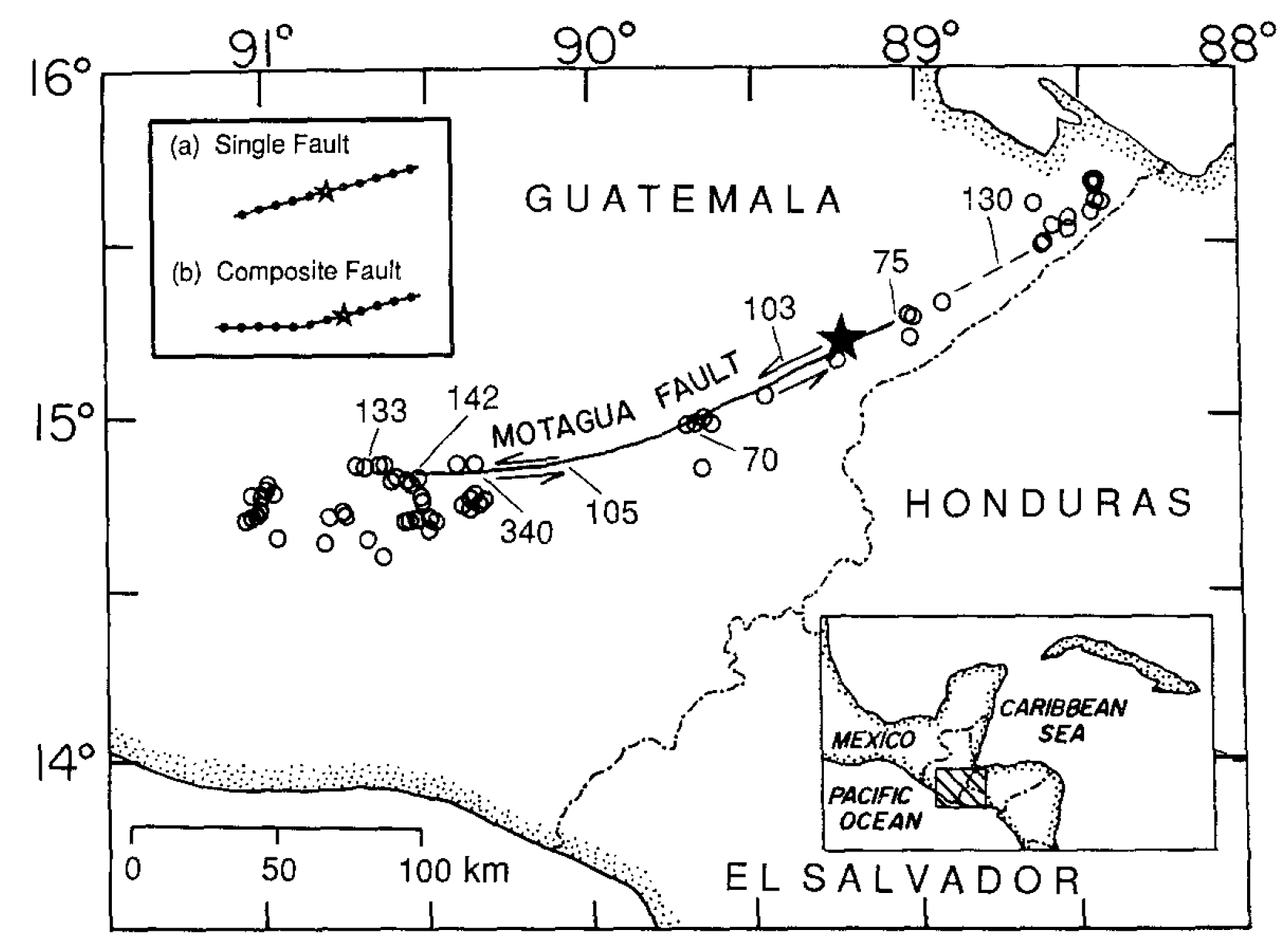 A map of the Motagua fault area, showing the locations of the 4 February 1976 main shock epicenter (star) and of locally determined aftershocks (circles) (after Langer et al., 1976). The earthquake was caused by sinistral slip of the Caribbean and North American Plates along the Motagua fault (shown as a solid line where observed and dashed where inferred). The numbers along the fault strike are the measured sinistral displacements in centimeters (from Plafker, 1976). The top left inset shows the fault model geometries that we used in our inversions for the rupture process: (a) a single fault with 75 ° strike, and (b) a composite fault consisting of two segments, one with a strike of 75° and the other with a strike of 90 °.