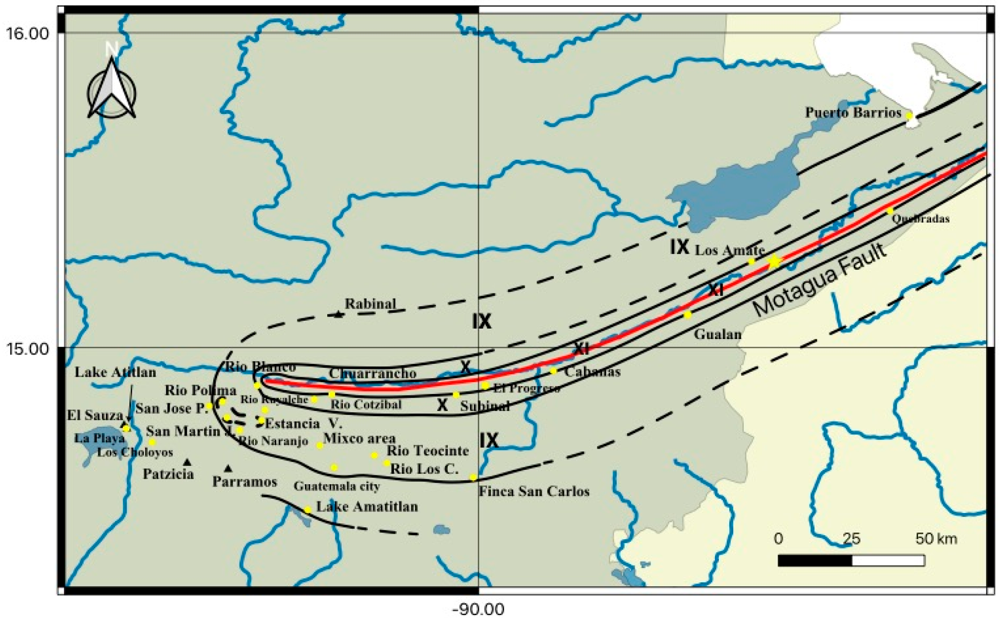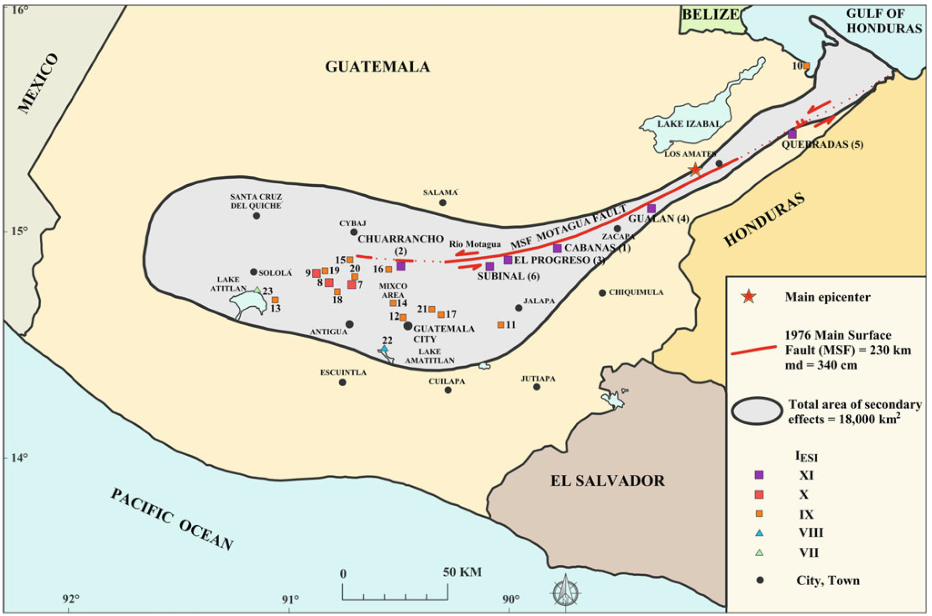 Map showing the main epicenter of 4 February 1976, Guatemala earthquake, the Motagua surface fault, the total area of secondary effects (modified after Plafker et al. 1976; Harp et al. 1981). The number indicates the main localities with the intensity value according to ESI scale (considering surface faulting, slope movements, ground cracks, liquefaction phenomena and ground settlements)