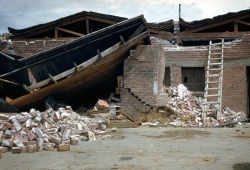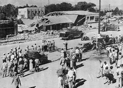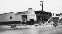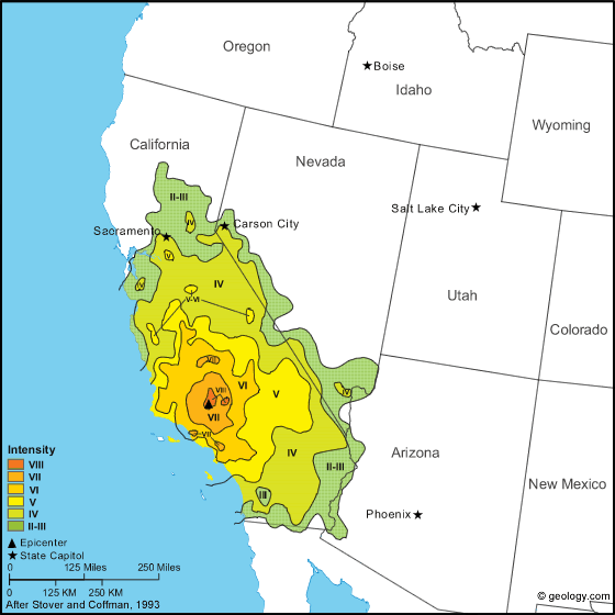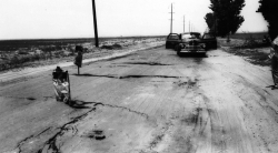 The White Wolf Fault at one time was not considered to be a major threat - most seismologists believing that it was not long enough to generate a sizeable tremor. However, when the Bakersfield Earthquake hit at 4:52 am on July 21, 1952, with up to 4 feet of elevation change, it caused severe damage as far away as Las Vegas (see the isoseismic damage map below). Twelve lives were lost, and there was at least $50 million in property damage. In addition, there were at least 20 aftershocks 5th magnitude or greater associated with the initial 7.5 magnitude shock, including a 5.8 magnitude tremblor that hit nearly a month later on August 22.