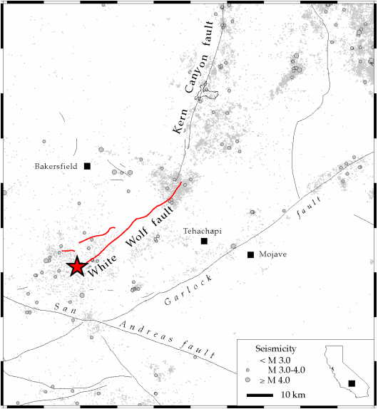 | The map above shows 1986-1996 earthquake activity in the White Wolf Fault area. The heavy red lines represent surface ruptures from the 1952 Kern County earthquake, and the red star indicates the epicenter for the main quake. |