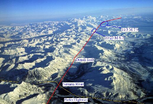 This high-altitude view shows the approximate locations of the earthquake epicenters. The view is eastward along the main strand of the Denali fault, which is marked here by a prominent linear valley along the southern edge of the Alaska Range. In the left foreground, the Nenana River marks the eastern boundary of Denali National Park. The Parks Highway, which connects Anchorage and Fairbanks, lies immediately east of the river north of the fault, but diverges from the river to the south. The epicenter of the November 3 earthquake was approximately 42 miles (68 km) east of the highway. In the distance, the rugged peaks of Mts. Deborah and Hess rise to about 12,000 feet (3650 m) just north of the epicenters and the bend in the Denali fault. (Photo and interpretation by Wesley K. Wallace, Geophysical Institute, University of Alaska Fairbanks) Follow this link to see the full resolution version of this photo. |