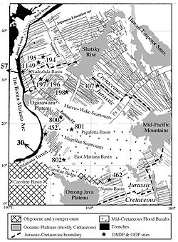 - Abrams, L.J.; Larson, R.L.; Shipley, T.H.; Lancelot, Y. (1993). "Cretaceous Volcanic Sequences and Jurassic Oceanic Crust in the East Mariana and Pigafetta Basins of the Western Pacific". In Prigle, M.S.; Sager, W.W.; Sliter, W.V.; et al. The Mesozoic Pacific: Geology, Tectonics, and Volcanism (PDF). Geophysical Monograph. 77. American Geophysical Union. pp. 77–101. ISBN 0-87590-036-4.