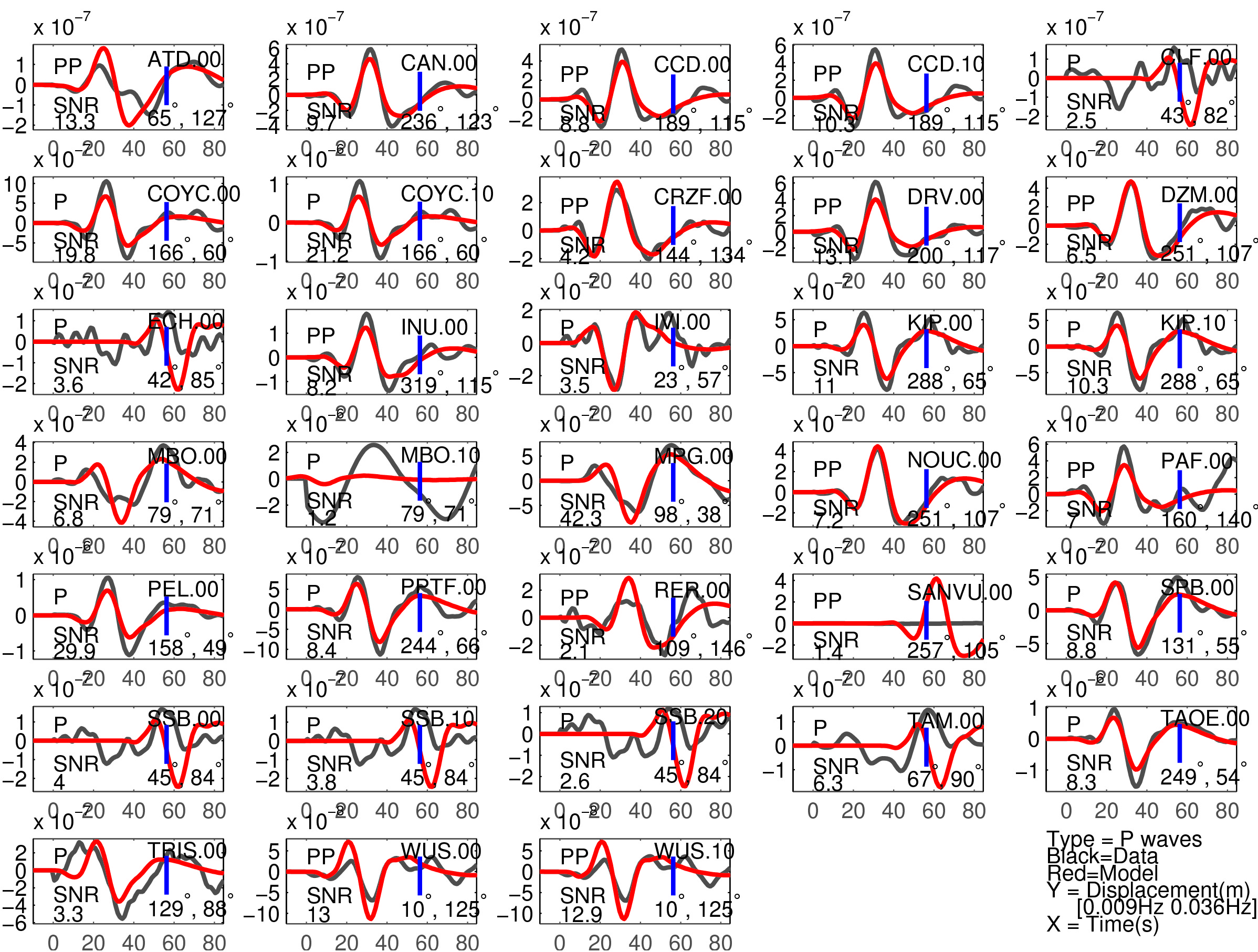 Figure 1: Agreement between data (black) and synthetics (red) for P or PP waves (the type of waves used is indicated in each subfigure). The comparison is shown with a time shift (noted 'Dt1' in Table 1), corresponding to the optimal fit ('Fit1' in Table 1) before the blue tick. Also indicated are the azimuth and distance of the station, and the signal to noise ratio (SNR). Note that the prediction done for PP waves is expected to be less accurate than the one for P waves.