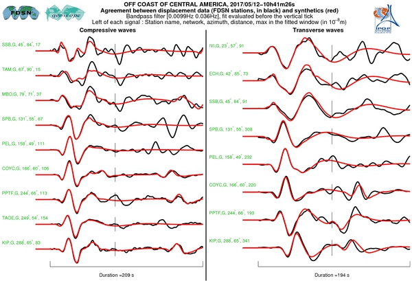 The SCARDEC solution is used here to predict the waveforms at all Geoscope stations received in real time and located at distances between 30° and 150° from the earthquake. All available location codes are used, for the BH* channels. In the range [30° - ~90°], the prediction is done on P and S(H) waves and in the range [~90° - 150°], it is done on PP and SS(H) waves. See agreement for P or PP waves (vertical components) between data and synthetics in Figure 1; see agreement for S(H) or SS(H) waves (horizontal components) between data (black) and synthetics (red) in Figure 2. Tables 1 and 2 provide quantitative estimates of these agreements.