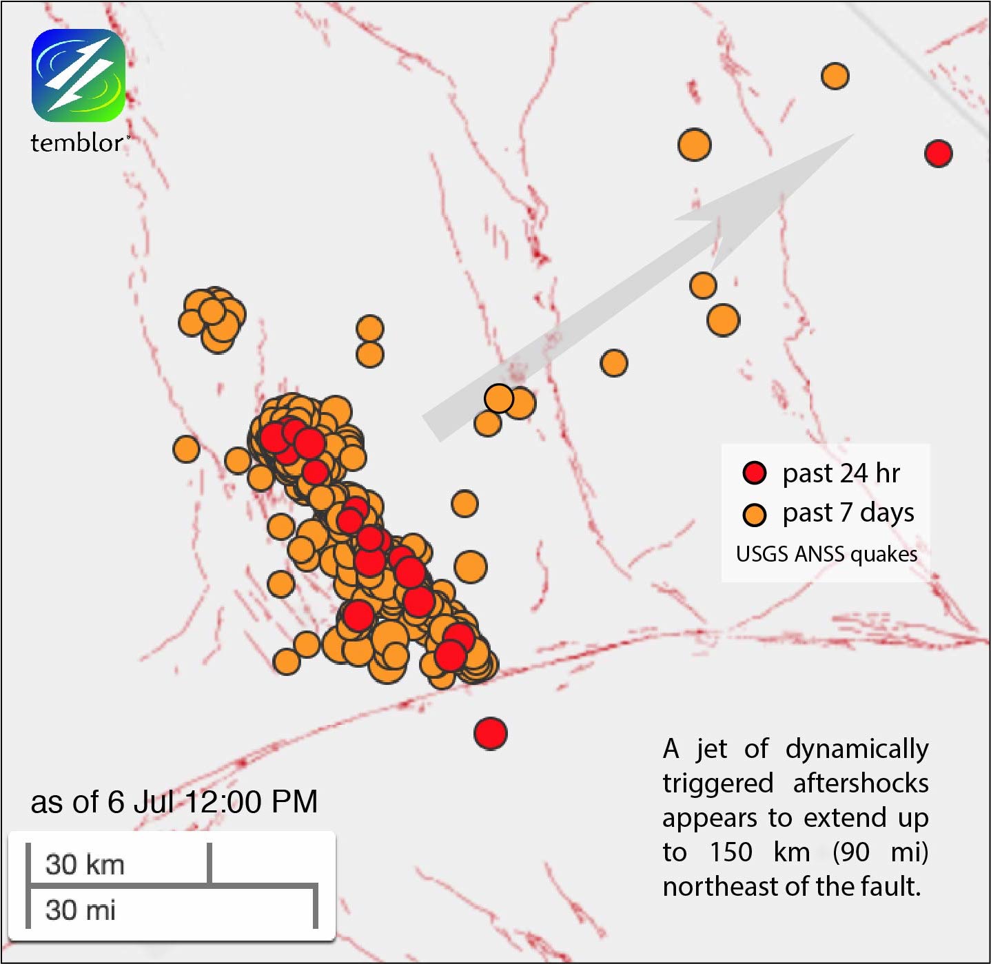 An unmistakable jet of aftershocks can be seen extending about 150 km (90 mi) to the northeast of the mainshock. These could be ‘busted locations,’ when the seismic network is overwhelmed by the waves from multiple quakes and therefore unable to accurately locate events. Accordingly, this observation is preliminary. But it looks remarkably like the remote aftershocks of the 1992 M 7.3 Landers earthquake, also in the Eastern California Shear Zone, discovered by Hill et al. (1993), and seen many times since for many, but certainly not all—other large quakes.