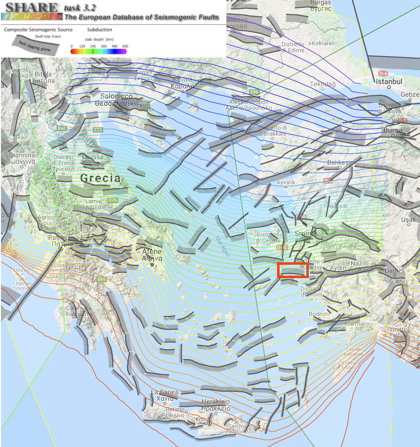 Le informazioni preliminari del terremoto privilegiano un faglia orientata Est-Ovest e direzione di immersione verso Nord e scorrimento normale, corrispondente approsimativamente alla faglia denominata Kaystrios nel database European Database of Seismogenic Faults (EDSF), evidenziata in figura dal rettangolo rosso.
