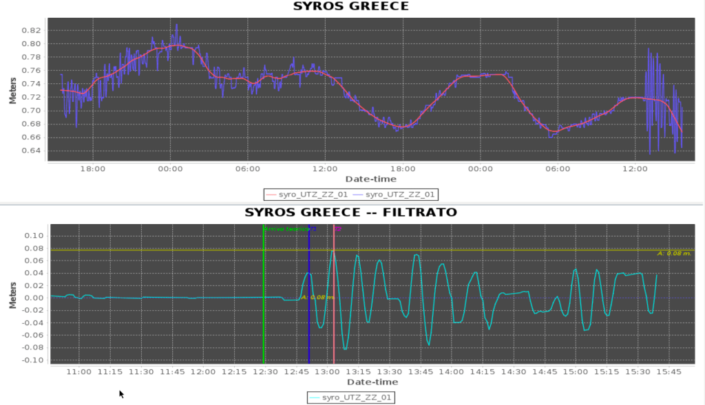 I messaggi vengono inviati dal CAT alla Protezione Civile nazionale e a molti Paesi dell’area euro-mediterranea. Per la conferma o la revoca dell’allerta il CAT si avvale della rete di mareografi presente nel Mediterraneo che vengono analizzati in tempo reale dai turnisti ed esperti del CAT per individuare eventuali anomalie. Nel caso del terremoto di oggi, dopo circa un’ora si sono iniziate a osservare delle anomalie, che hanno quindi determinato l’invio del messaggio di conferma (come si vede dalla figura del mareogramma per la stazione di Syros).